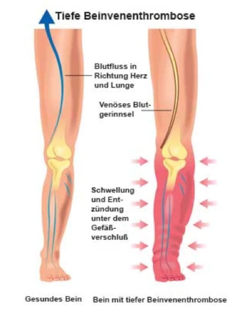 Vom Bein aus entwickelt sich die Thrombose weiter und kann die Hauptvene bzw. die Beckenvenen im Beckenbereich befallen.