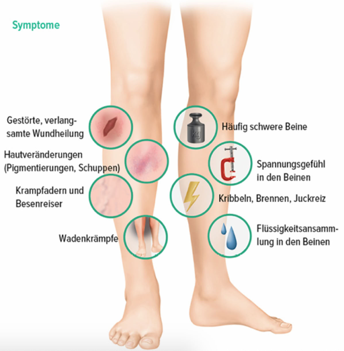 Die Beine können sich schwer und müde anfühlen, auch ein brennendes Gefühl oder nächtliche Krämpfe sind möglich.